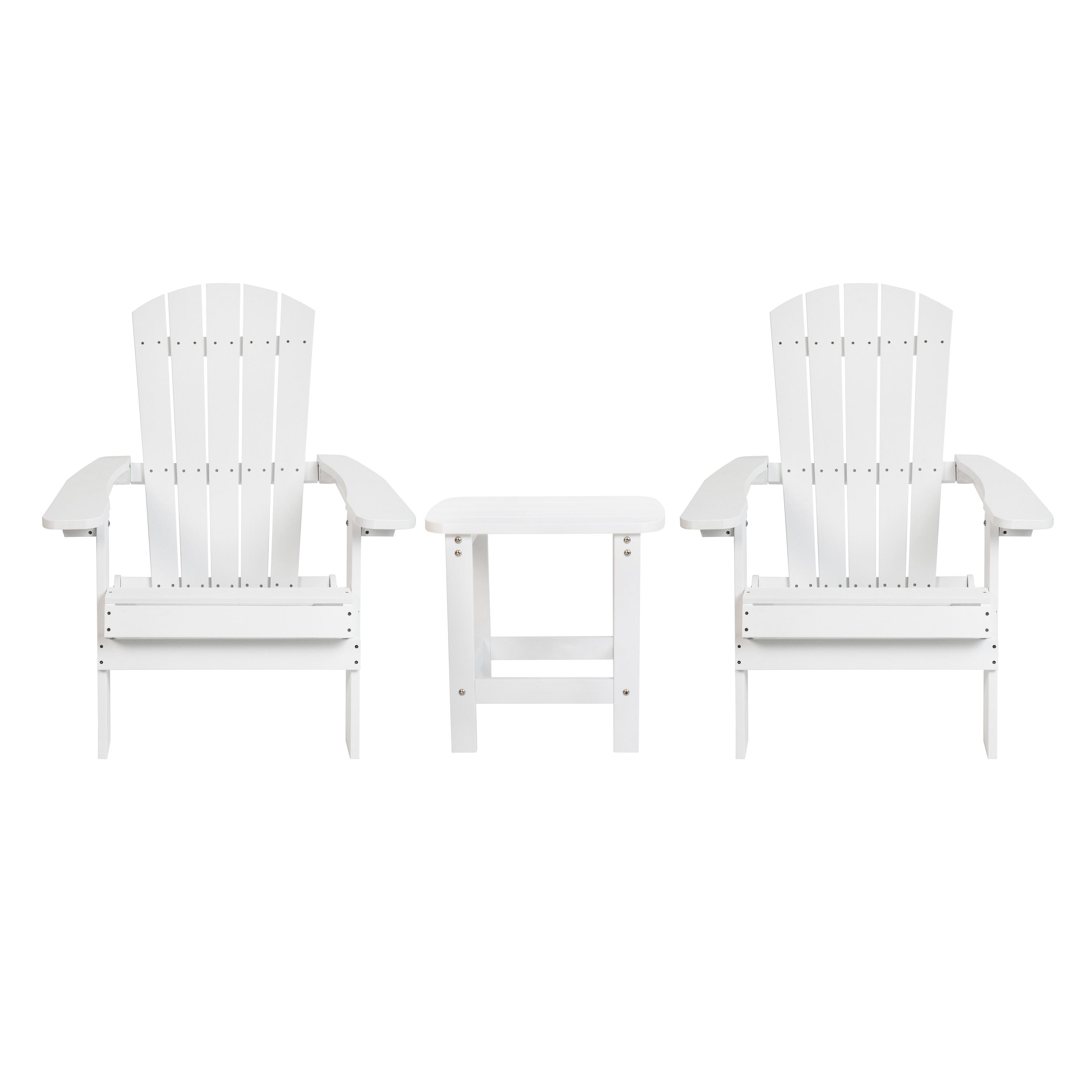 Brand Name FLASH UPC Code 840196323107 Product Family Collis Set Includes Adirondack Chair-2;Adirondack Side Table-1 Planned to Discontinue Yes Warranty 1 Year Limited Rated For Commercial Use Yes Cleaning Code Damp cloth Assembly Required Yes Assembly Level Medium Assembly Time Frame 30-60 Minutes Item Weight 79.9 Weight Capacity 350 Table Weight Capacity 200 Seating Capacity 2 Colors White Overall Dimensions 34"D x 30.25"W x 37"H Extended Dimensions PRODUCT MEASUREMENTS: Overall Size: Overall Size: 30.25"W x 34"D x 37"H; Seat Size: 20.5"W x 19"D x 14.5"H; Back Size: 18.5"W x 32"H; Arm Size: 20.75"H from floor; 11"H from seat | Table Size: 18.75"W x 15"D x 18.25"H Bullet_1 Indoor/Outdoor Adirondack Seating Set Bullet_2 Poly Resin Composition won't chip, peel, or rot; UV Treated to prevent fading Bullet_3 2 Folding Adirondack Chairs: 30.25"W x 34"D x 37"H Bullet_4 Classic Lattice Back Slanted Seat encourages reclining Bullet_5 Extra Wide Seat and Arms for a comfortable seating experience Bullet_6 Adirondack Side Table: 18.75"W x 15"D x 18.25"H Bullet_7 Horizontal Lattice Table Top mirrors the look of your chairs Bullet_8 Lightweight Design for easy portability Bullet_9 Weather Resistant Stainless Steel Hardware for long-lasting use Bullet_10 Assembles in 30 Minutes or Less with fully illustrated instructions and included tools Product Copy Your leisure time just got much more relaxing with this commercial grade set of 2 all-weather folding Adirondack chairs and matching accent table. The classic design of this Adirondack seating set has stood the test of time and will make a lovely addition to any space. Whether your favorite spot is the beach, a campsite, or your own back yard the ability to fold these lounge chairs makes it infinitely easier to transport this seating group and also makes storage a breeze.