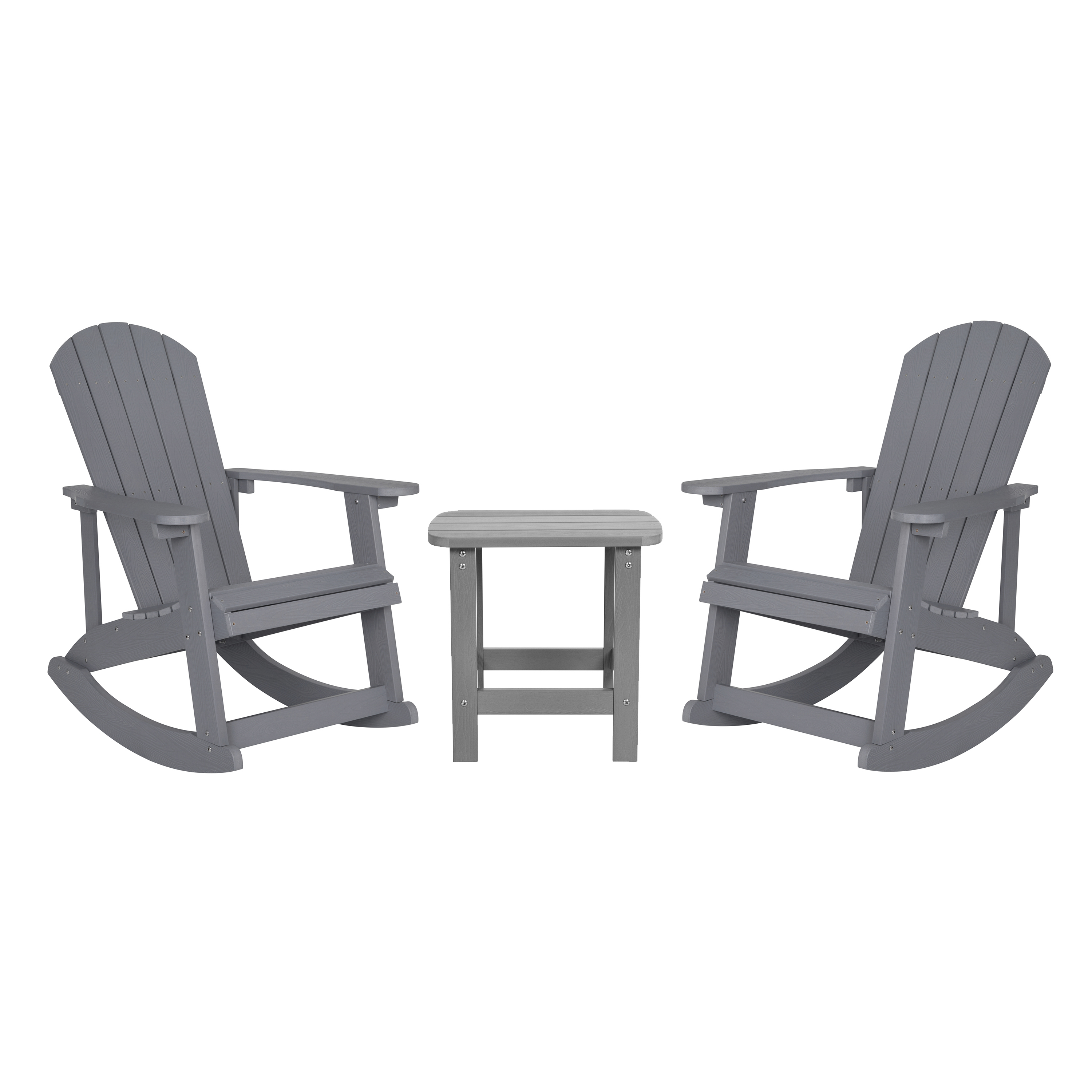 Set of 2 Savannah Commercial Grade All-Weather Poly Resin Wood Adirondack Rocking Chairs with Side Table in Gray