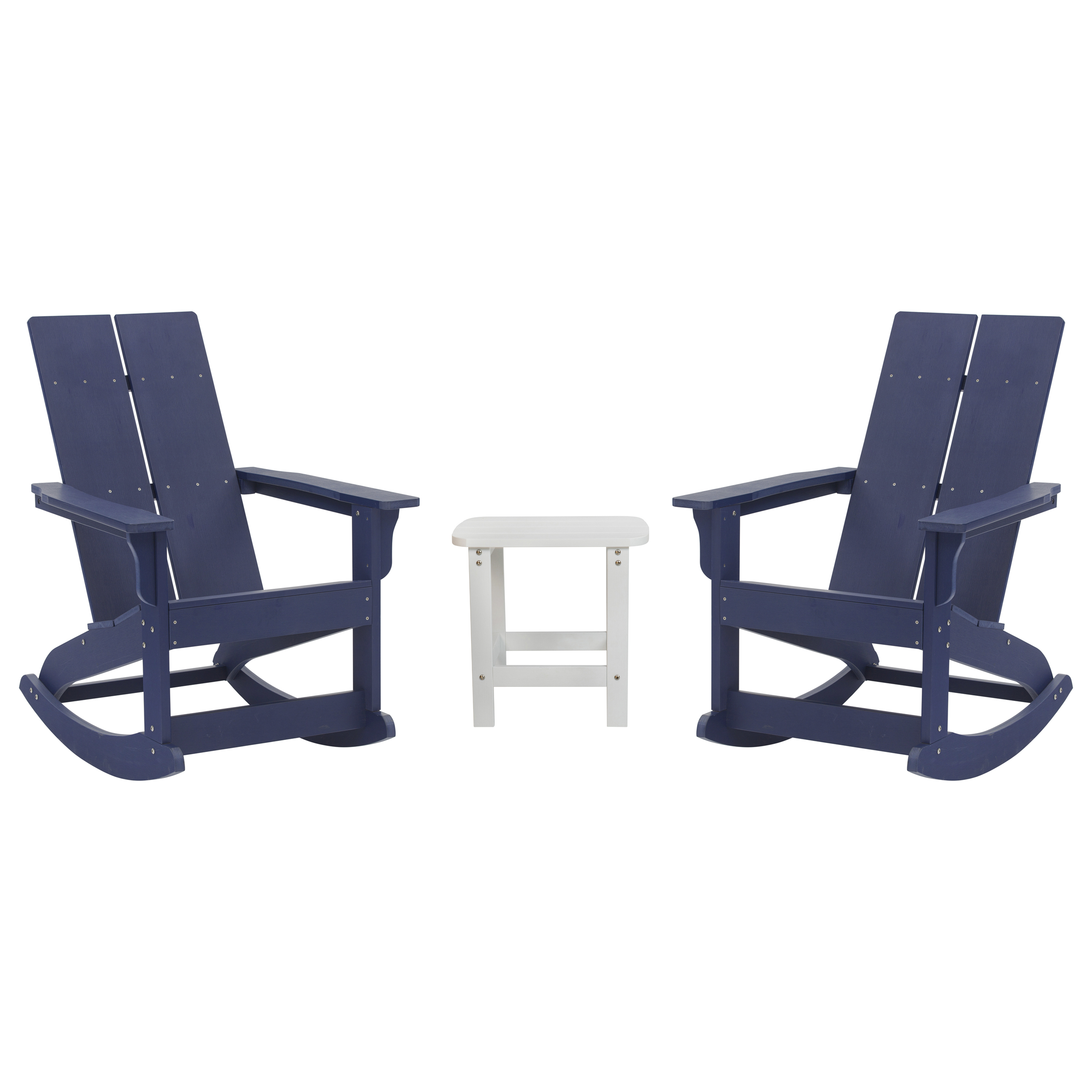 Set of 2 Navy Finn Modern Commercial Grade All-Weather 2-Slat Poly Resin Rocking Adirondack Chairs with Complementary White Side Table