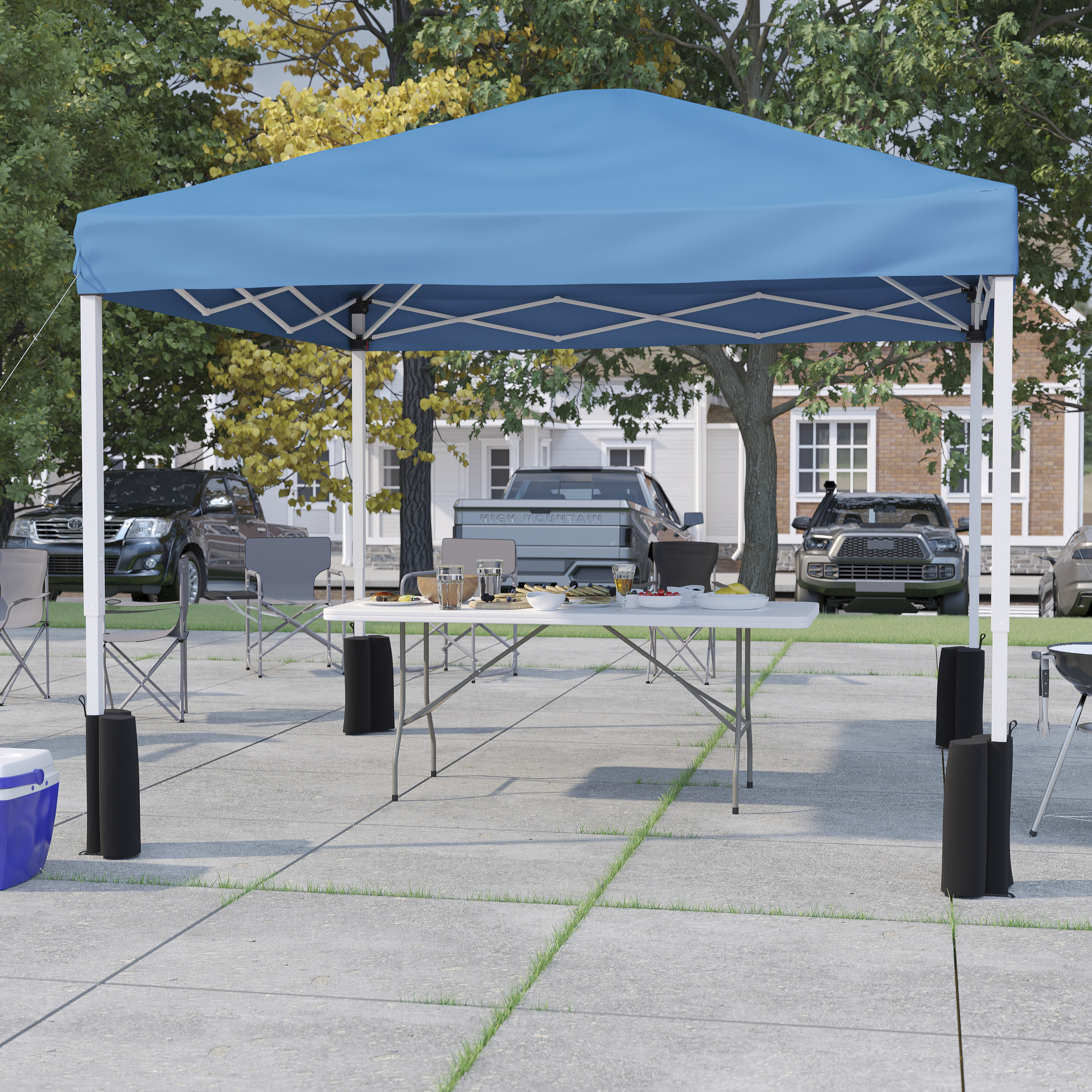 Otis 10'x10' Blue Pop Up Canopy Tent with Wheeled Case and 6-Foot Bi-Fold Folding Table with Carrying Handle - Tailgate Tent Set