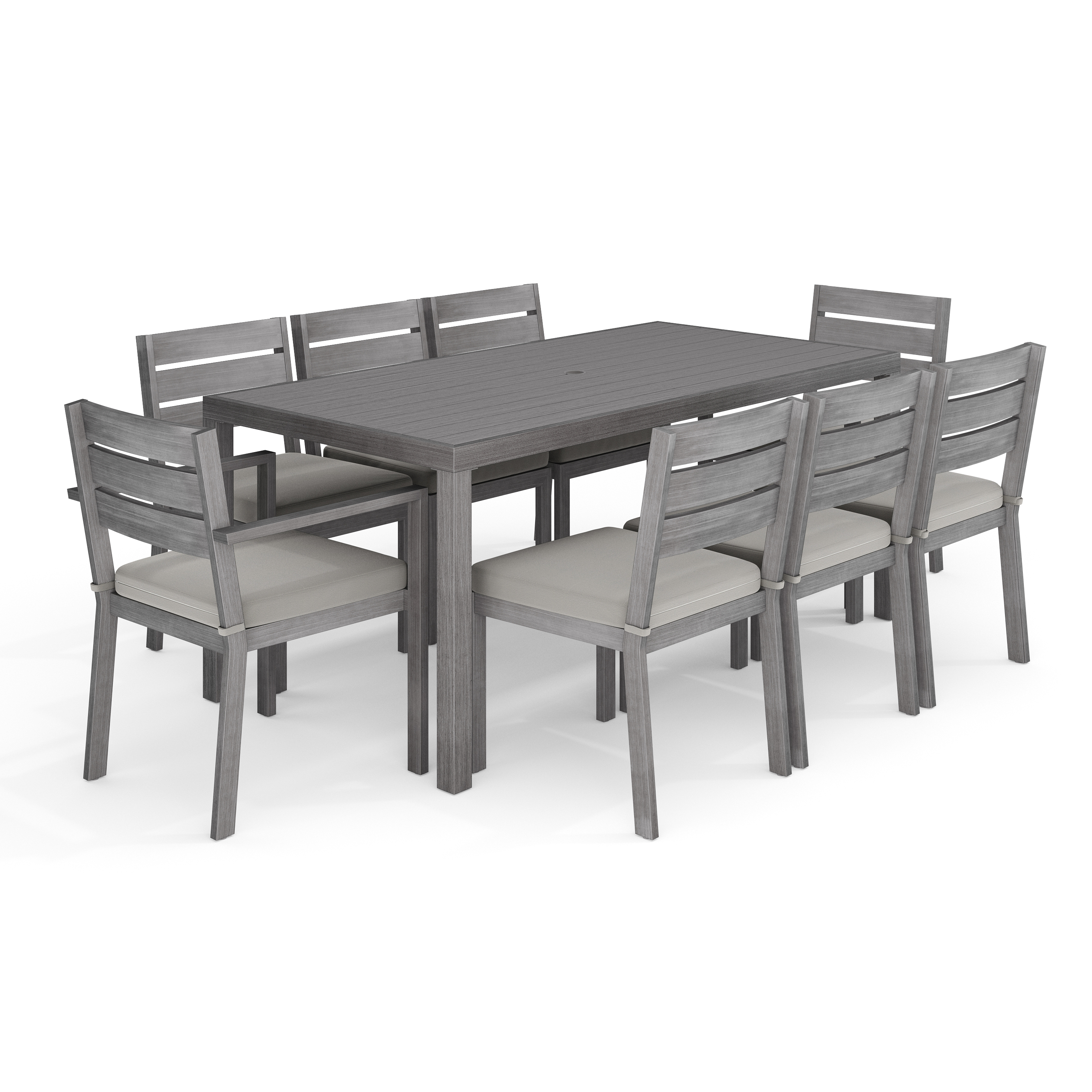 Bedford Indoor-Outdoor Patio Set with 71" Table and 8 Dining Chairs with Gray Brushed Woodgrain Aluminum Finish and Gray All-Weather Seat Cushions