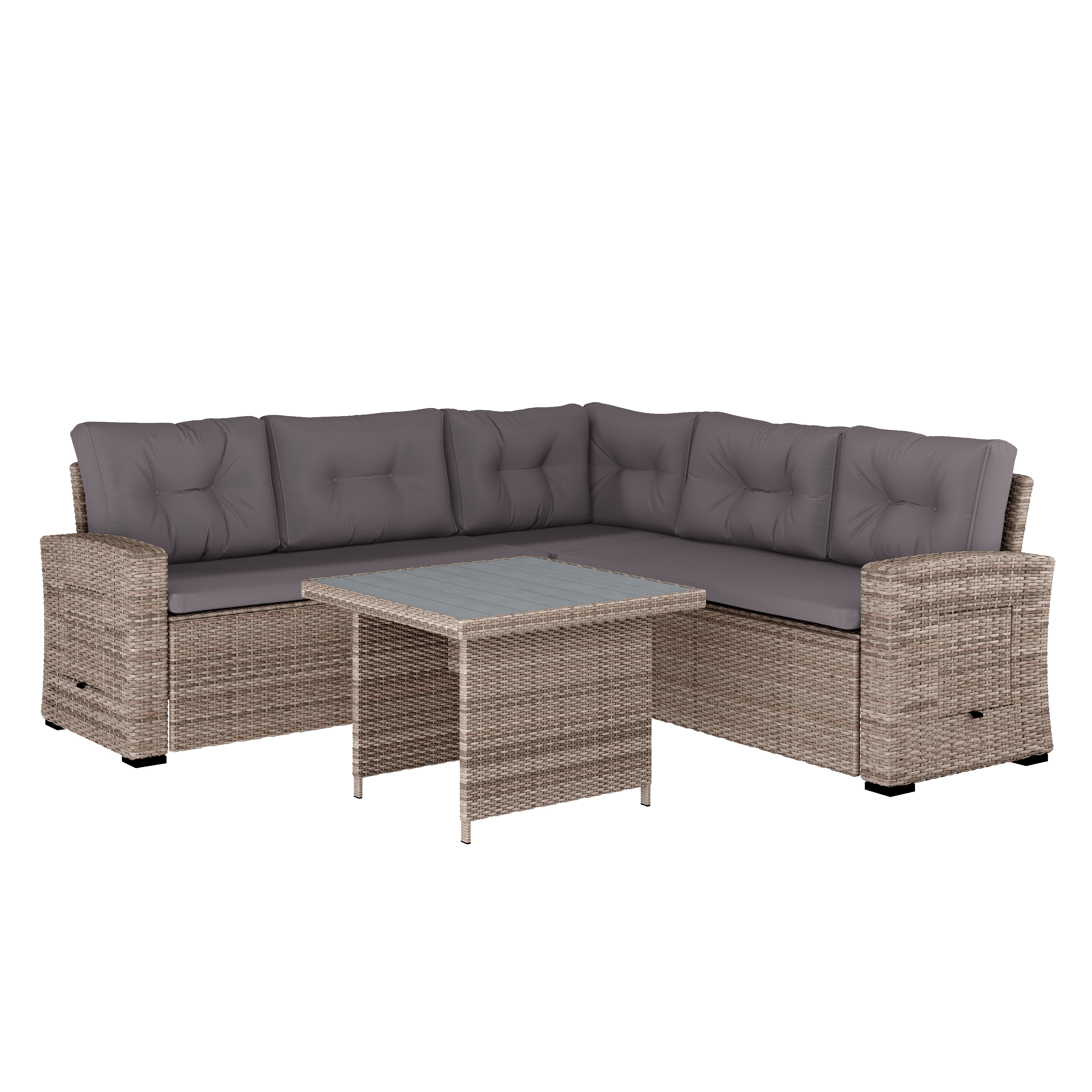 Brand Name FLASH UPC Code 196861152672 Product Family Huck Set Includes Patio Sectional-1;Patio Coffee Table-1 Planned to Discontinue No Warranty 1 Year Limited Rated For Commercial Use Yes Cleaning Code Water and neutral detergent Assembly Required Yes Assembly Level Medium Assembly Time Frame 30-60 Minutes Item Weight 63.0 Weight Capacity 1500 Table Weight Capacity 440 Seating Capacity 5 Colors Gray Overall Dimensions 28.25"D x 82.75"W x 32.5"H Extended Dimensions PRODUCT MEASUREMENTS: 82.75"W x 28.25"D x 32.5"H; Seat Size: 74"W x 27.5"D x 16.75"H; Back Size: 74"W x 20"H; Arm Size: 21.5"H from floor; 9"H from seat; Table Size: 35"W x 35"D x 25"H Bullet_1 Indoor/Outdoor Conversation Set With L-Shaped Sofa and Table With Faux Wood Top Bullet_2 Gray Cushions/Gray Frame Bullet_3 All-Weather UV-Resistant Woven Wicker Rattan Structure Bullet_4 Sectional Sofa Features Water-Repellent, UV-Coated Plush Cushions and Seats up to Five Guests Bullet_5 Side Lift-Out Table for Additional Serving and Display Space Bullet_6 Rust-Resistant Powder-Coated Steel Frame is Strong and Durable Bullet_7 Fixed Floor Glides Prevent Damage to Hard Flooring Surfaces Bullet_8 Each Sectional Piece Holds up to 600 lbs. Static Weight, Table Holds up to 440 lbs. Static Weight Bullet_9 Assembly Takes About 60 Minutes With Hardware, Tools, and Easy-to-Follow Instructions Included Bullet_10 Wipes Clean With a Damp Cloth; Cushions Can Be Removed and Cleaned With Water and Neutral Cleaner Product Copy Relaxation and style come together in perfect harmony with this indoor/outdoor wicker rattan conversation set that includes an L-shaped sofa and a dining table. This versatile use set is perfect for spaces inside and outside of the house, including the living room, sunroom, patio, or poolside deck. Seat up to five guests on the comfortable sofa featuring plush cushions made from UV-coated polyester fabric. This set is built for all weather conditions thanks to a UV-resistant woven rattan structure, rust-resistant powder coated steel frames, and water-repellent cushions. For extra serving and display space, the sofa also features a side lift-out table, perfect for a bowl of chips or holding drinks while you and your friends take in a game night. The dining table boasts a faux wood top for a stylish look and dependable structure. Fixed floor glides are also included to prevent damage to hard flooring surfaces. This set is also built with strength in mind, with each piece of the sectional sofa holding up to 600 lbs. static weight while the table can hold up to 440 lbs. static weight. Assembly takes approximately 60 minutes, with hardware, tools, and easy-to-follow instructions included. The set is easy to clean, wiping clean with a damp cloth, while the cushions can be removed and cleaned with water and a neutral cleaner. Game nights, gatherings, and get-togethers are going to be extra cozy thanks to this wicker rattan conversation set.