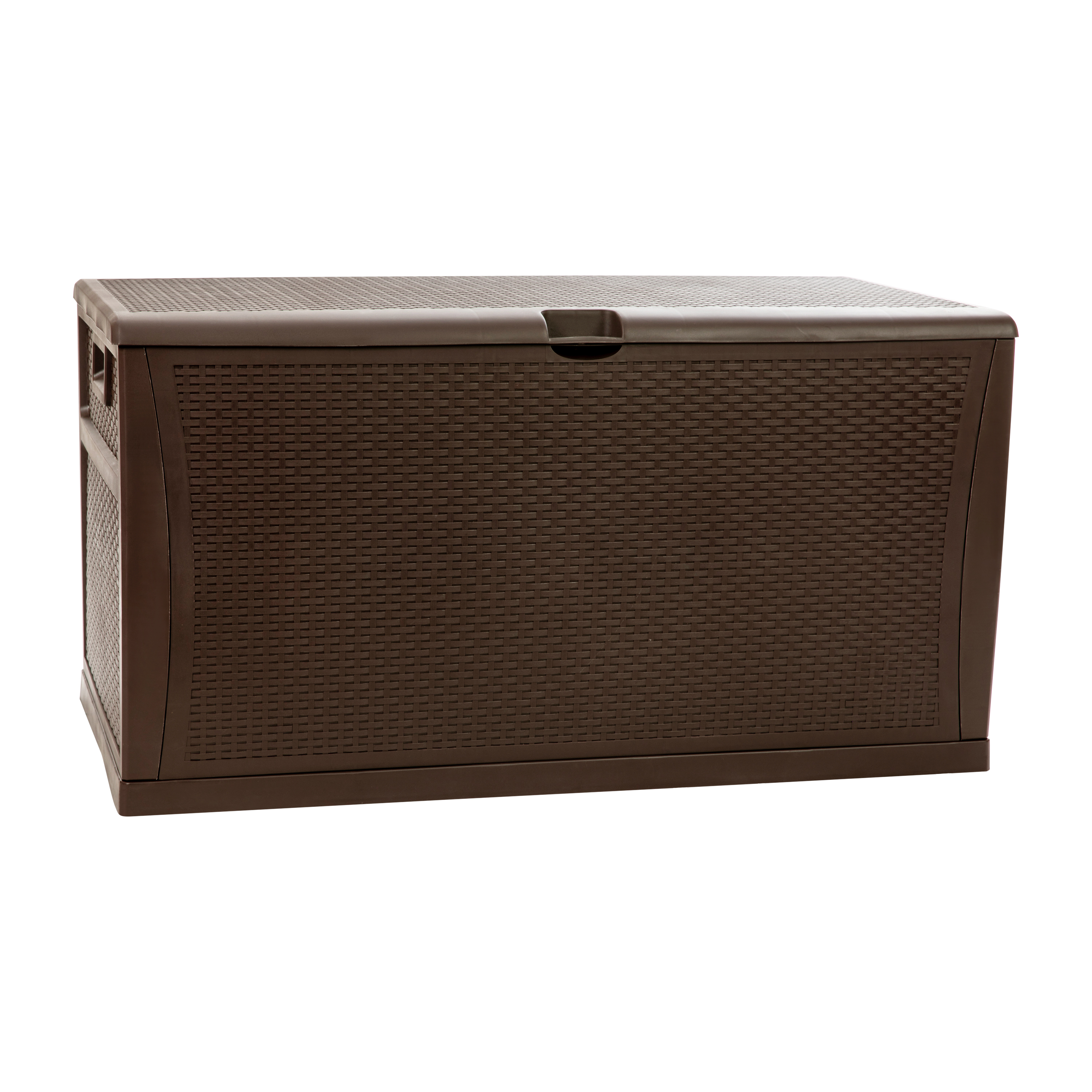 Brand Name FLASH UPC Code 889142980773 Product Family Marlin Planned to Discontinue No Warranty 1 Year Limited Rated For Commercial Use No Assembly Required No Assembly Level Easy Assembly Time Frame 1-10 Minutes Item Weight 26.0 Weight Capacity 220 Capacity [Gallons] 120 Colors Brown Overall Dimensions 24"D x 47"W x 25"H Extended Dimensions PRODUCT MEASUREMENTS: Overall Size: 47"W x 24"D x 25"H; Inner Storage Size: 43.75"W x 22"D x 23.5"H Bullet_1 Contemporary 120 Gallon Deck Box for indoor or outdoor use Bullet_2 Woven Motif complements almost any décor Bullet_3 Chest Design and Hinged Lid for easy access Bullet_4 Polypropylene Construction resists rust, peeling or denting Bullet_5 UV Treated to Prevent Fading Bullet_6 Stores up to 220 LBS Static Weight Capacity; Lid Seating up to 180 LBS Static Weight Capacity Bullet_7 Add Padlock for Added Security (Not Included) Bullet_8 Snap-Together Assembly in Under 10 Minutes Bullet_9 Extra large storage box for everything from pool toys to extra blankets Product Copy Unclutter your space and quickly find what you're looking for when you organize all of your deck, patio, and backyard items in this 120 gallon plastic deck box. The woven motif mimics wicker and can blend seamlessly in any environment while the chest design can provide extra seating up to 180 lbs static weight capacity. An included floor panel helps this deck storage box protect your chair cushions, garden tools, or your outdoor accessories from the elements when not in use. This multipurpose storage box can also be used indoors for storing extra linens, out of season clothing, or in the garage for extension cords, life jackets, and other miscellaneous items that always seem to find their way to the garage.