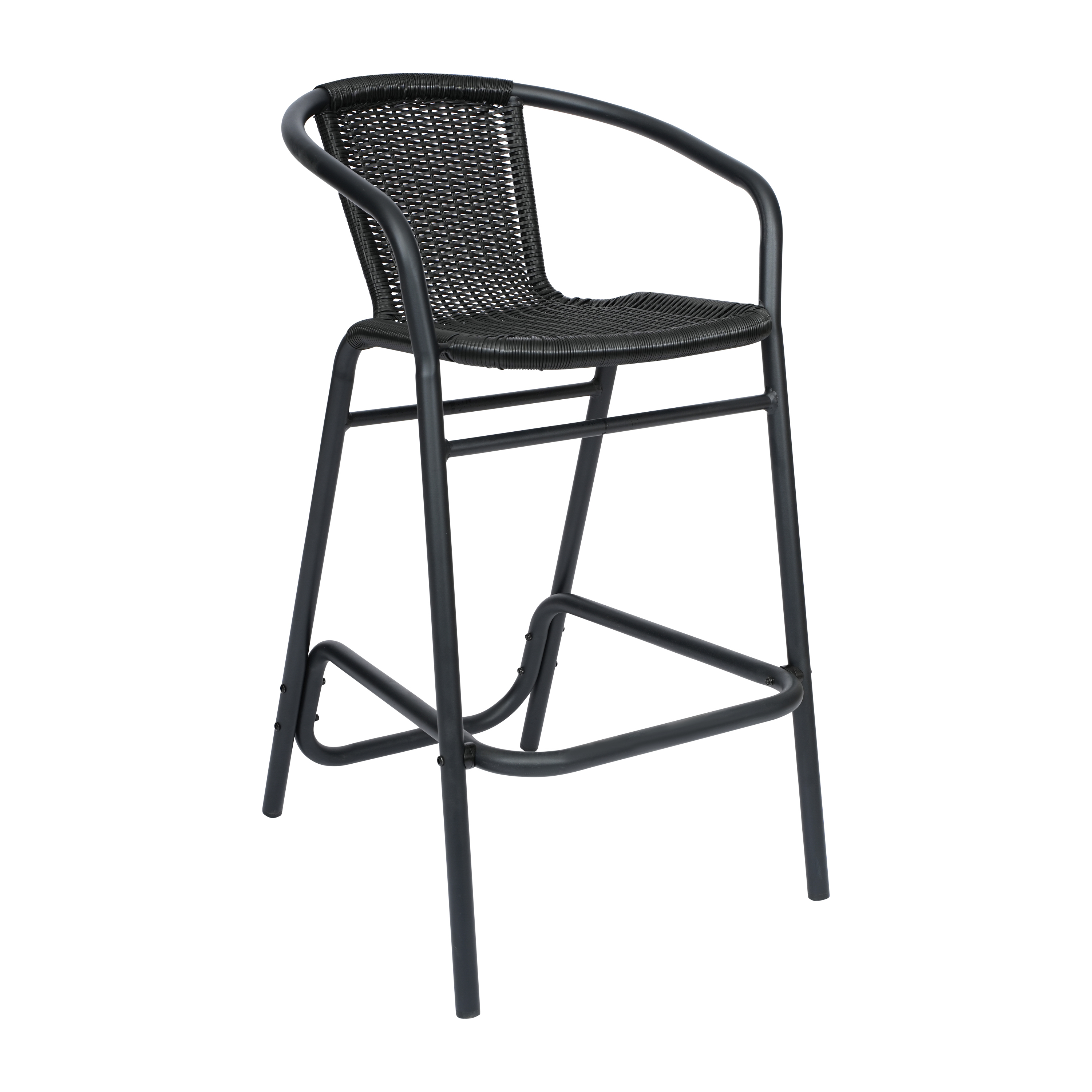 Lila Commercial Grade Indoor-Outdoor PE Rattan Restaurant Barstool with Black Aluminum Frame and Footrest in Black