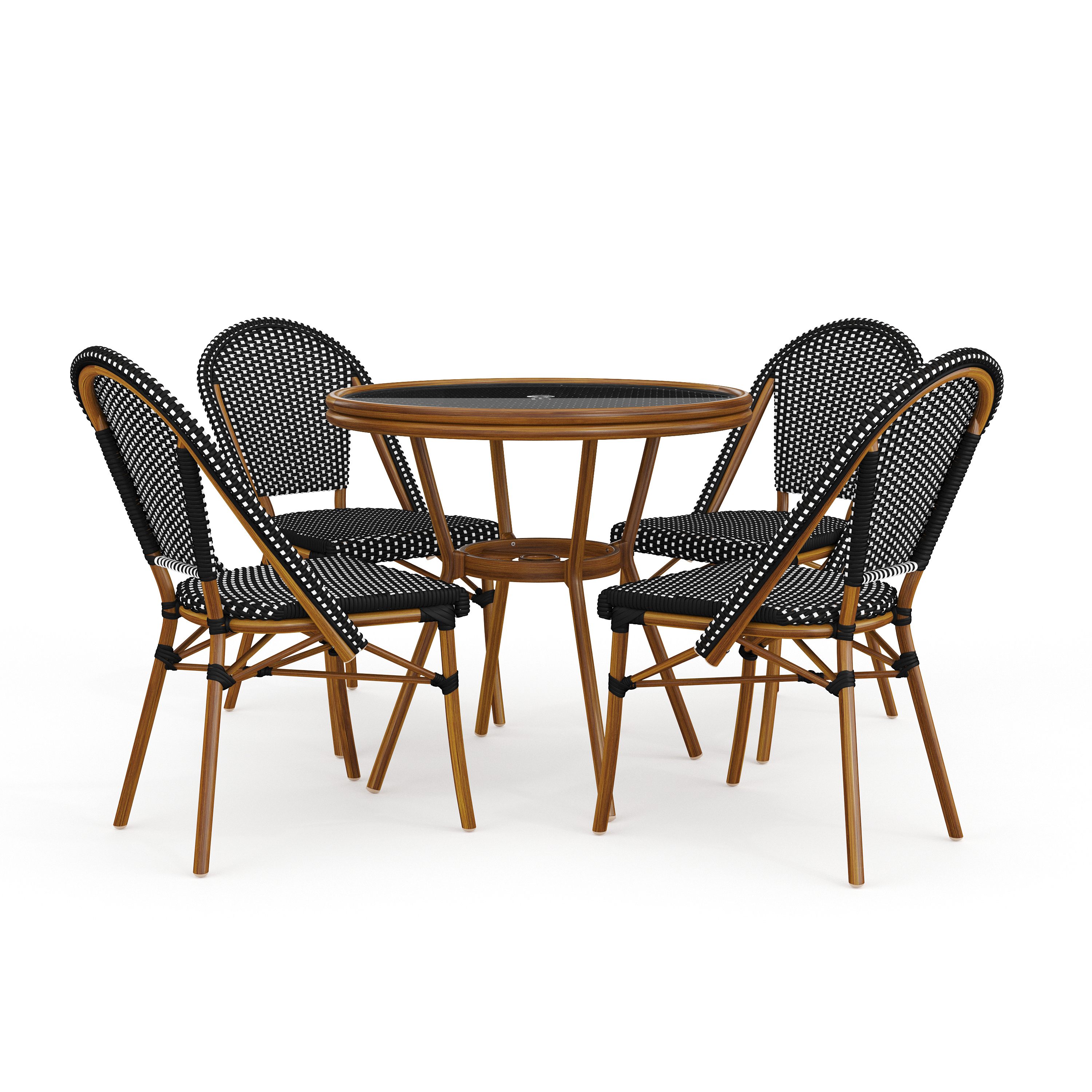 Lily Pond 31.5" Round Indoor-Outdoor Bistro Dining Table with 4 Stackable Bistro Chairs - Black/White with Natural Woodgrain Aluminum Finish Frame