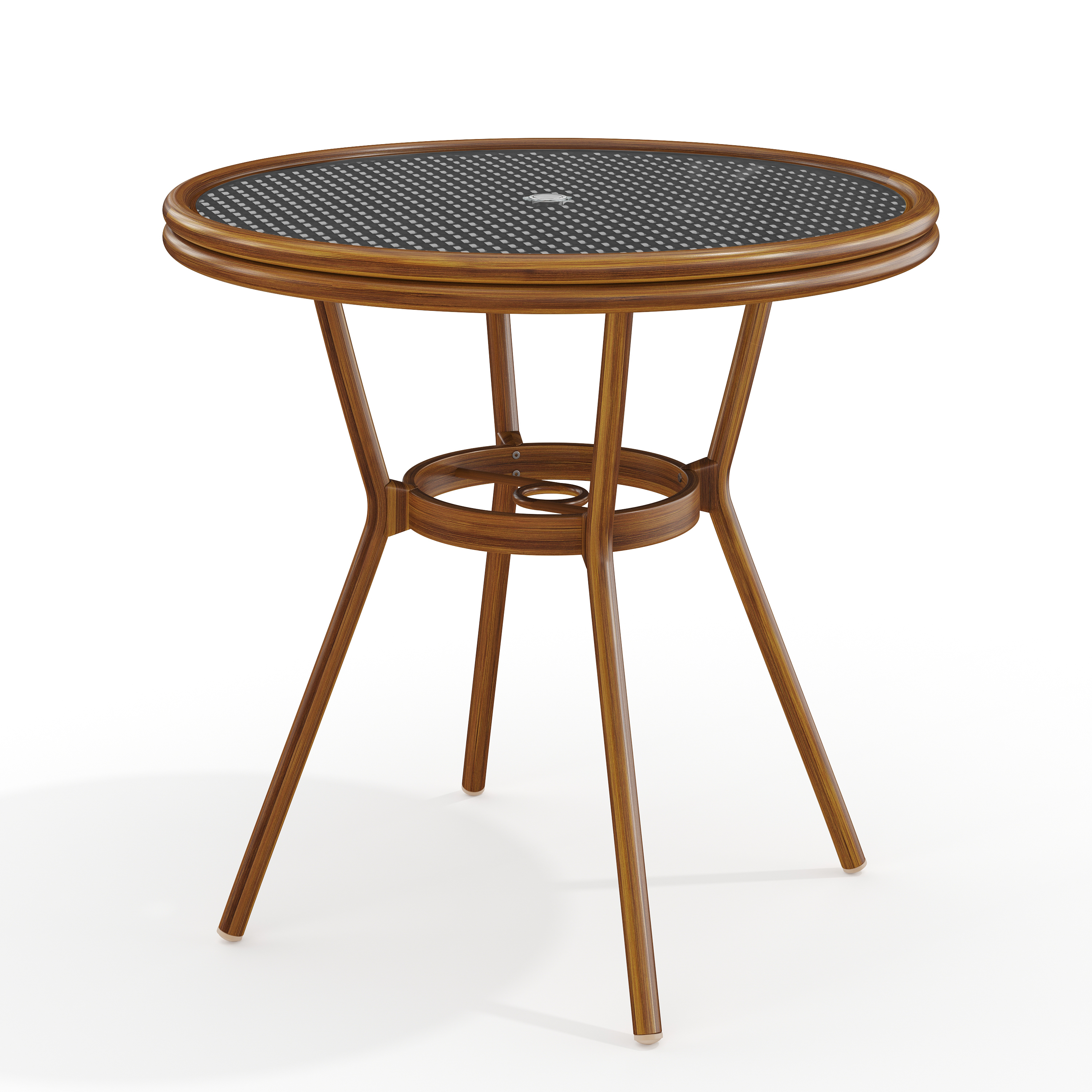 Lily Pond 31.5" Round Indoor-Outdoor Bistro Dining Table with Natural Woodgrain Aluminum Finish Frame and Black/White Woven Rattan Tabletop