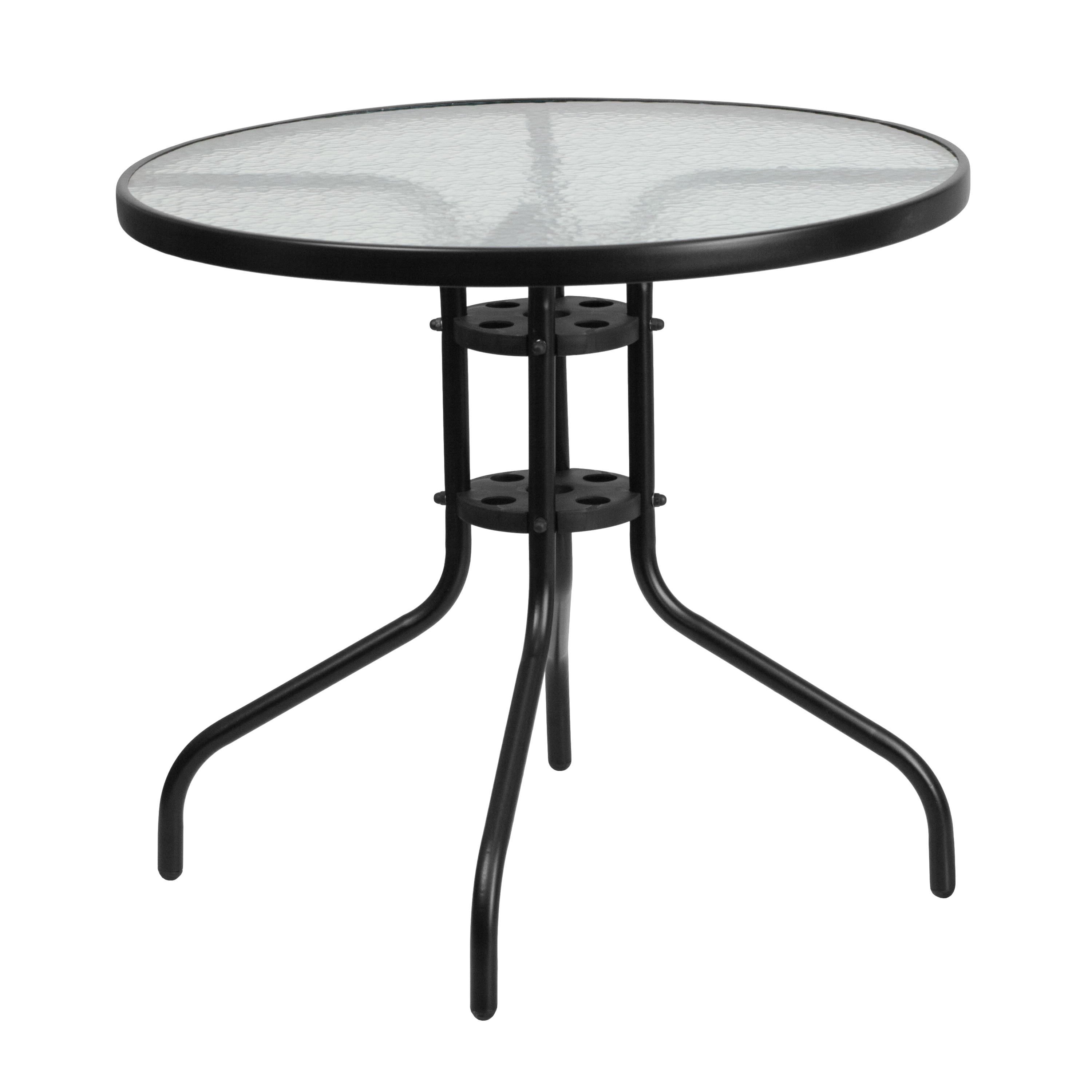 Brand Name FLASH UPC Code 889142043720 Product Family Raven Planned to Discontinue No Warranty 1 Year Limited Rated For Commercial Use Yes Cleaning Code Solvent and water based cleaner such as foam Assembly Required Yes Assembly Level Easy Assembly Time Frame 1-10 Minutes Item Weight 23 Weight Capacity 132 Table Weight Capacity 130 Seating Capacity 3 Colors Black Overall Dimensions 31.5"D x 31.5"W x 28"H Extended Dimensions PRODUCT MEASUREMENTS: Overall Size: 31.5"W x 31.5"D x 28"H Bullet_1 All Occasion Round Table Top with Base Bullet_2 Top Size: 31.5" Round Bullet_3 Base Size: 22"W Bullet_4 Clear Tempered Glass Surface Bullet_5 5mm Thick Glass Bullet_6 1.375" Edge Top Bullet_7 Black Powder Coat Finish Bullet_8 Protective Plastic Floor Glides Bullet_9 Designed for Indoor and Outdoor Use Bullet_10 Designed for Commercial and Residential Use Product Copy Whether you need to add more seating space or create an intimate conversation area, this versatile round tempered glass top table is up to the task. Enhance the look of your bistro, cafe, restaurant, hotel or home patio space without taking up too much real estate. The ripple designed table top features a smooth surface for keeping items level. A black powder coat finish lends the round-shaped table a bold, versatile appearance that matches well with your favorite chairs. Designed for all-weather use, this table is a great option for indoor and outdoor settings. For longevity, care should be taken to protect from long periods of wet weather. Whether you are just starting your business or upgrading your furniture this table is a wise investment.