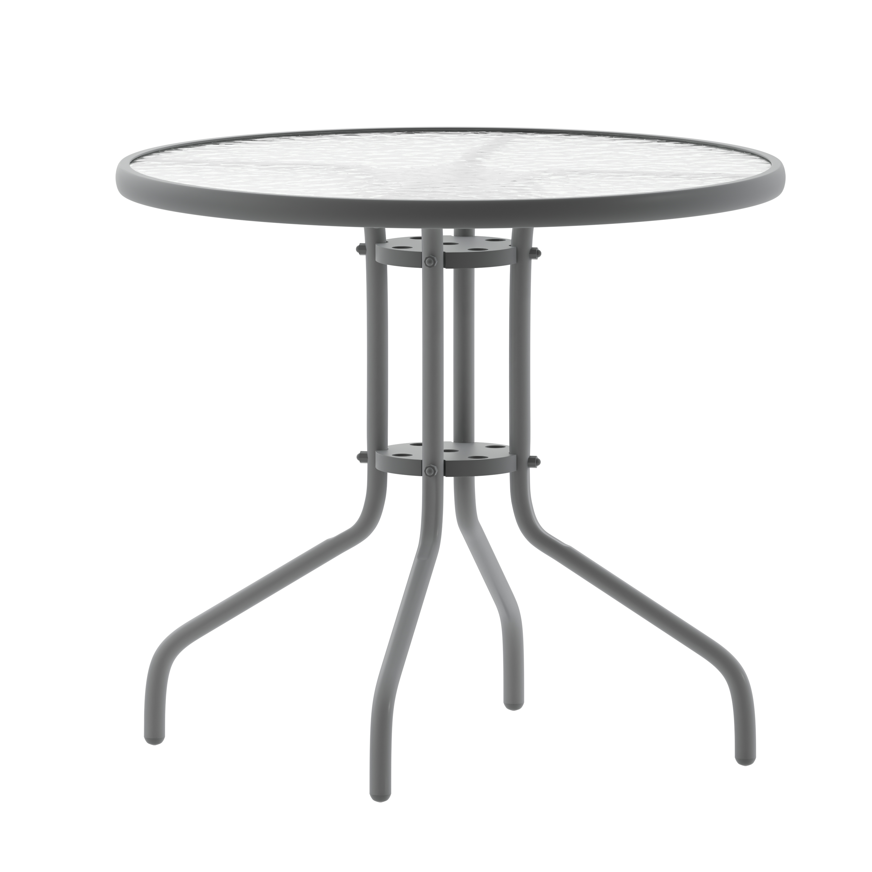 Brand Name FLASH UPC Code 196861102219 Product Family Raven Planned to Discontinue No Warranty 1 Year Limited Rated For Commercial Use Yes Cleaning Code Solvent and water based cleaner such as foam Assembly Required Yes Assembly Level Easy Assembly Time Frame 1-10 Minutes Item Weight 23 Weight Capacity 132 Table Weight Capacity 130 Seating Capacity 3 Colors Silver Overall Dimensions 31.5"D x 31.5"W x 28"H Extended Dimensions PRODUCT MEASUREMENTS: Overall Size: 31.5"W x 31.5"D x 28"H Bullet_1 All Occasion Round Table Top with Base Bullet_2 Top Size: 31.5" Round Bullet_3 Base Size: 22"W Bullet_4 Clear Tempered Glass Surface Bullet_5 5mm Thick Glass Bullet_6 1.375" Edge Top Bullet_7 Silver Powder Coat Finish Bullet_8 Protective Plastic Floor Glides Bullet_9 Designed for Indoor and Outdoor Use Bullet_10 Designed for Commercial and Residential Use Product Copy Whether you need to add more seating space or create an intimate conversation area, this versatile round tempered glass top table is up to the task. Enhance the look of your bistro, cafe, restaurant, hotel or home patio space without taking up too much real estate. The ripple designed table top features a smooth surface for keeping items level. A silver powder coat finish lends the round-shaped table a bold, versatile appearance that matches well with your favorite chairs. Designed for all-weather use, this table is a great option for indoor and outdoor settings. For longevity, care should be taken to protect from long periods of wet weather. Whether you are just starting your business or upgrading your furniture this table is a wise investment.