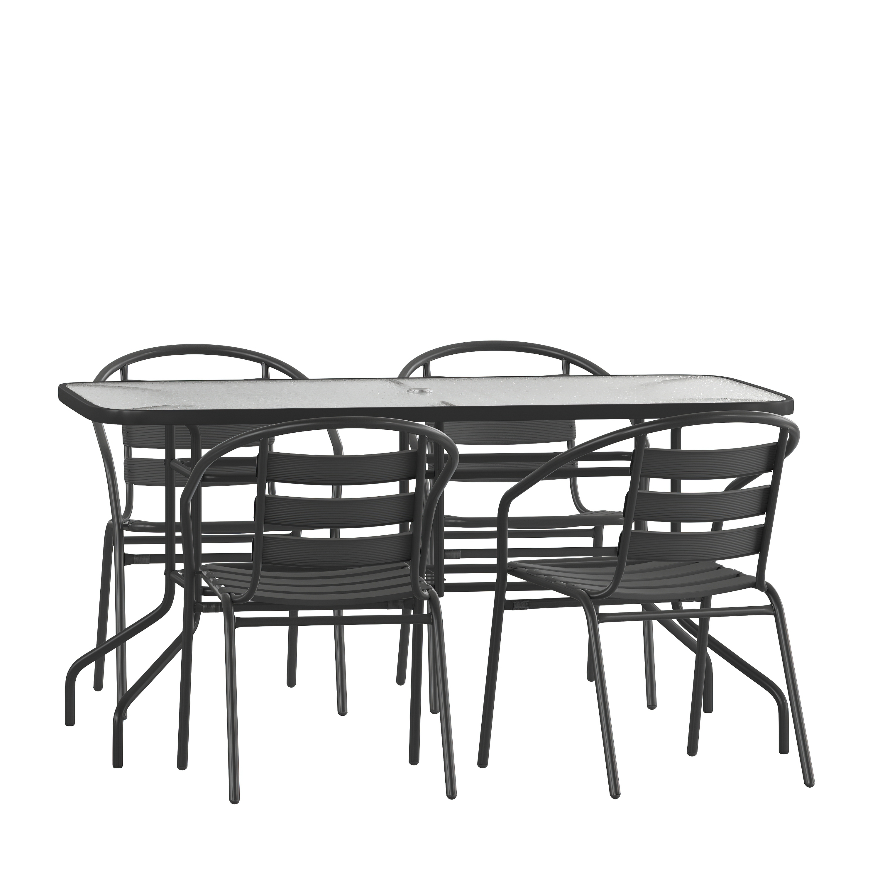 Lila 5 Piece Patio Dining Set - 55" Tempered Glass Patio Table with Umbrella Hole - 4 Black Metal Aluminum Slat Stack Chairs