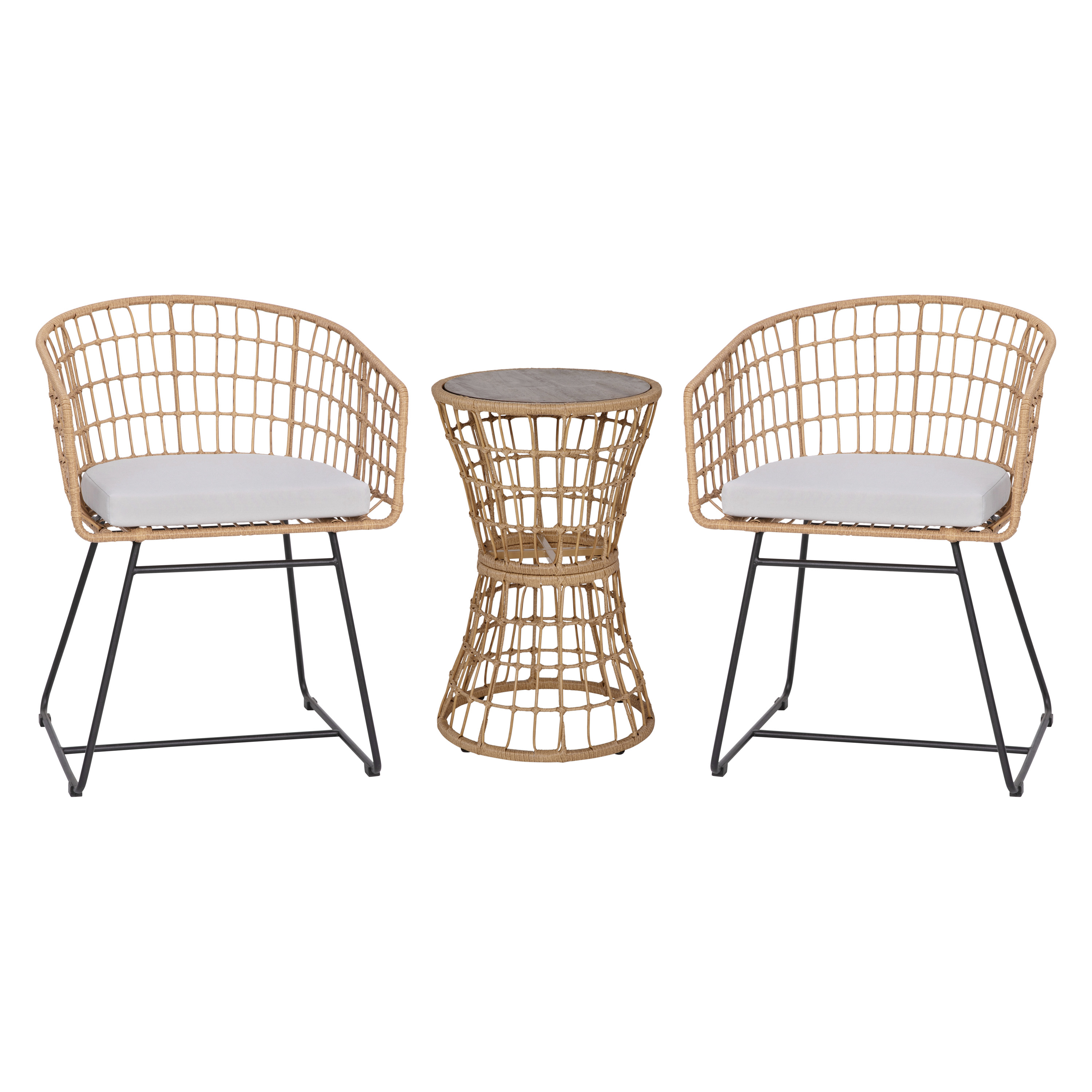 Brand Name FLASH UPC Code 196861025549 Product Family Dorado Set Includes Patio Table-1;Patio Chair-2 Planned to Discontinue Yes Warranty 1 Year Limited Rated For Commercial Use No Cleaning Code Damp cloth Assembly Required No Assembly Level Easy Assembly Time Frame 1-10 Minutes Item Weight 28.1 Weight Capacity 300 Table Weight Capacity 200 Seating Capacity 2 Colors Gray, Natural Overall Dimensions 15.75"D x 15.75"W x 25"H Extended Dimensions PRODUCT MEASUREMENTS: Chair Size (2): 21.25"W x 22.5"D x 29.75"H; Seat Size: 19"W x 17.75"D x 19.75"H; Back Size: 14"W x 14"H; Arm Size: 26"H from floor; 8.5"H from seat | Table Size: 15.75"W x 15.75"D x 25"H; No Assembly Required Bullet_1 Modern 3 Piece Boho Style Indoor/Outdoor Rattan Rope Patio Bistro Set with Table and Cushions Bullet_2 2 Woven Polyethylene Rattan Chairs in a Natural Finish Bullet_3 Removable Light Gray Polyester Seat Cushions with Comfort Foam Core Bullet_4 Black Powder Coated Frames Hold up to 300 LBS. Static Weight Capacity Per Chair; Fixed Floor Glides Bullet_5 Circular Side Table with Acacia Wood Top Holds up to 200 LBS. Static Weight Bullet_6 Black Powder Coated Steel Frame with Adjustable Floor Glides Bullet_7 Weather and Fade Resistant Materials for Indoor and Outdoor Use Bullet_8 Cleans Easily with a Damp Cloth; Zippered Cushion Covers May Be Hand Washed and Air Dried Bullet_9 Assembly Takes Less Than 10 Minutes Per Piece with Included Materials Product Copy Effortless elegance is yours with the click of a button in this 3 piece bistro conversation set ideal for your indoor or outdoor spaces. Gently rounded backs and deep seats paired with super sturdy metal sled bases give the two club chairs a trendy, boho look that appeals to the eye. Padded polyester seat cushions with a comfort foam core provide a soft, cozy perch to enjoy some quiet time or hang out with friends. The matching hourglass shaped accent table, with an acacia wood top, pulls the look together for a classically cozy conversation area.