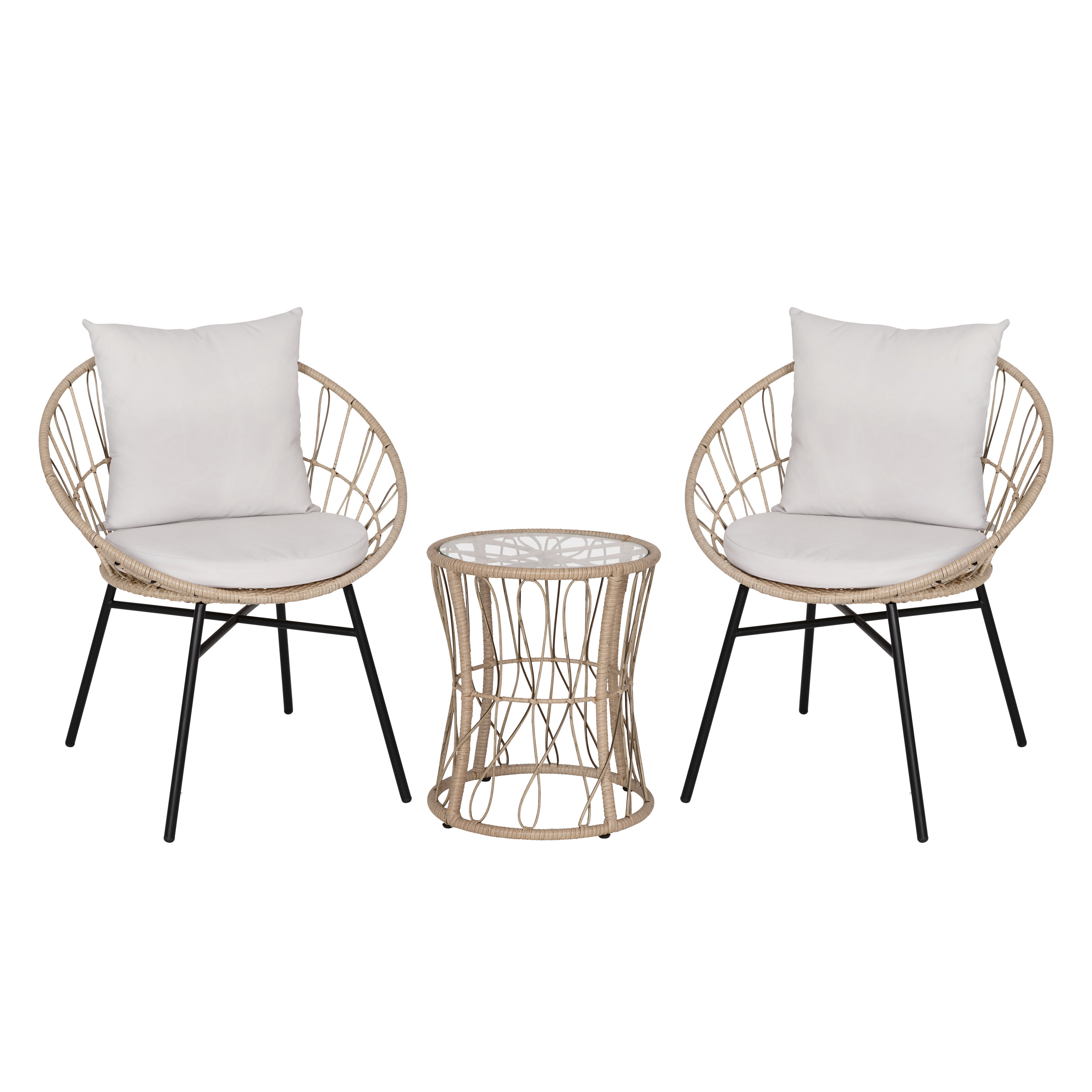 Devon 3-Piece Tan Indoor/Outdoor Bistro Set, Papasan Style Rattan Rope Chairs, Glass Top Side Table & Light Gray Cushions