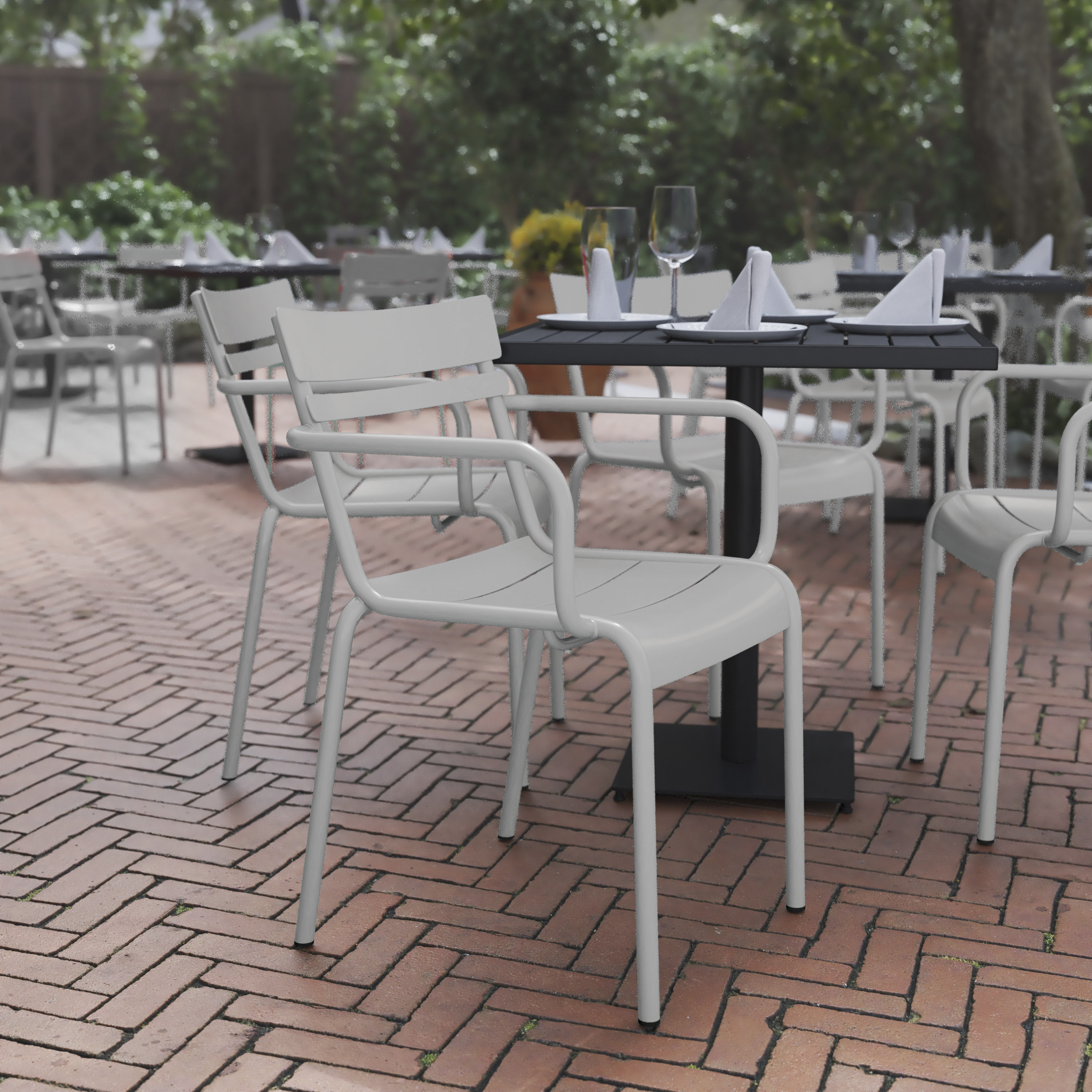 Brand Name FLASH UPC Code 196861093401 Product Family Nash Planned to Discontinue No Warranty 5 Years Limited Rated For Commercial Use Yes Cleaning Code Damp cloth Assembly Required No Item Weight 18 Weight Capacity 300 Stack Quantity 8 Colors Silver Overall Dimensions 23"D x 22.75"W x 32.75"H Extended Dimensions PRODUCT MEASUREMENTS: Overall Size: 22.75"W x 23"D x 32.75"H; Seat Size: 15.25"W x 16.75"D x 18.5"H; Back Size: 18.75"W x 12.5"H; Arm Size: 27.5"H from floor; 9.25"H from seat Bullet_1 Modern Commercial Grade Indoor/Outdoor Steel Stack Chair Bullet_2 Glossy Silver Finish Bullet_3 Ergonomically Contoured Dry Assist Slatted Back and Seat Bullet_4 Powder Coated Steel Frame Holds up to 300 LBS. Static Weight Bullet_5 UV and Weather Resistant Bullet_6 Recommended Stack Height up to 8 Chairs Bullet_7 Easily Wipes Clean with a Damp Cloth Bullet_8 No Assembly Required Bullet_9 Pairs With Other Items In The Collection Product Copy Sleek modern style is upwardly mobile and affordable with this modern commercial grade stack chair with arms. Ideal for any indoor or outdoor space at your restaurant, bar, kitchen, or patio the slatted, contoured design of the back and seat aids with airflow and water drainage for comfort and quick turnaround for seating. The rounded arms relieve pressure from the neck and shoulders for full relaxation.