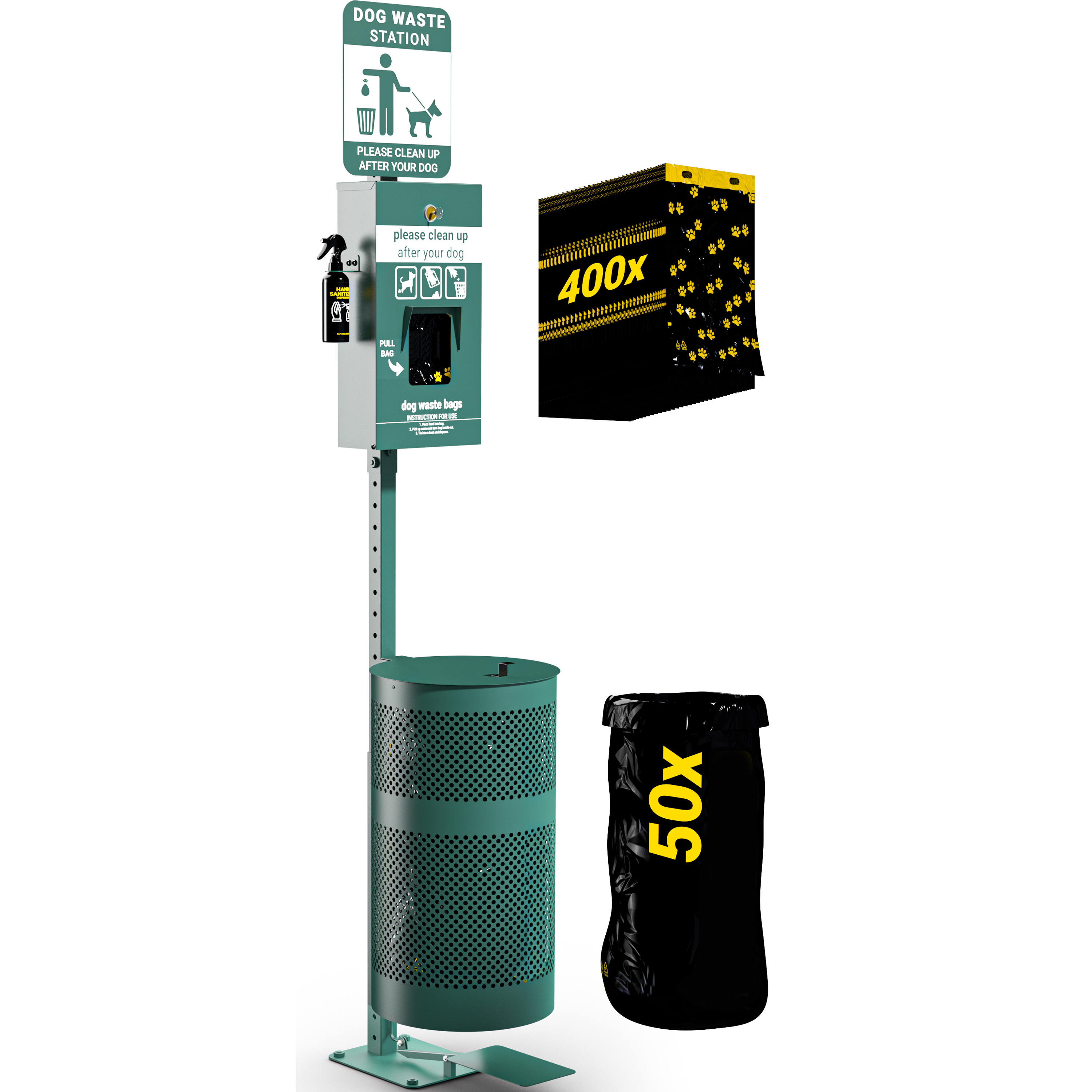 Brand Name FLASH UPC Code 196861063503 Product Family Kessler Planned to Discontinue No Warranty 1 Year Limited Rated For Commercial Use Yes Cleaning Code Damp cloth Assembly Required Yes Item Weight 43.0 Capacity [Gallons] 11.5 Colors Green Overall Dimensions 12.2"D x 18.11"W x 75.98"H Extended Dimensions PRODUCT MEASUREMENTS: Overall Size: 18.11"W x 12.2"D x 75.98"H Bullet_1 Pet Waste Station with Lidded Pedal Trash Can Bullet_2 Heavy Duty Green Powder Coated Galvanized Steel Bullet_3 High Visibility Glow-In-The-Dark Signage Bullet_4 Locking Pull-Out Waste Bag Dispenser Bullet_5 Hand Sanitizer Bottle Included Bullet_6 Includes 2 Locking Dispenser Keys, 400 Pull-Out Bags and 50 Trash Liners Bullet_7 Assembles in 30 Minutes or Less Bullet_8 Suitable for Commercial and Residential Use Bullet_9 Recommended Installation on Cement Ground Pad Product Copy Daily walks are a great source of fun and exercise for owners and beloved pets alike, but it can lead to unplanned stops along your favorite walking routes when mother nature calls. Give pet owners everything they need to leave your neighborhood, dog park, or public walking trails as clean as they found them when you install this pet waste station. From leakproof rolls of pet waste bags to a hand sanitizer bottle, this set makes pickup and disposal of pet waste less of a chore