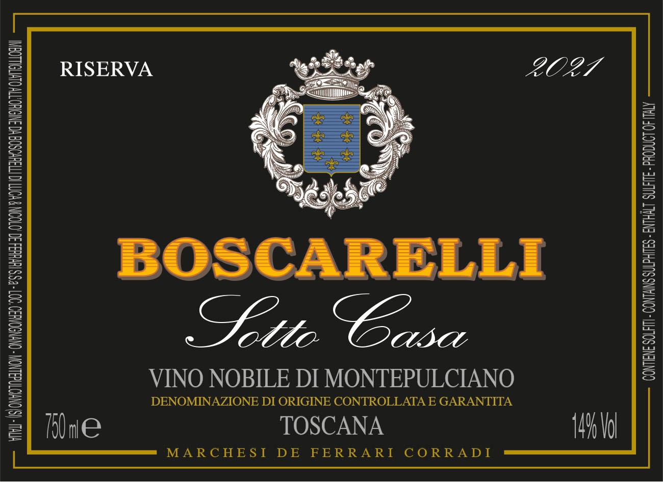 | Wine Description | The “Sotto Casa” Riserva has been produced since 2011 and is a natural evolution of the Boscarelli Vino Nobile Riserva "black label.” The wine harmonizes the elegance, character and freshness of Sangiovese, with the tannic texture, structure and fullness of two international varieties : Cabernet Sauvignon and Merlot. The grapes come only from the historical vineyard “Sotto Casa.” |